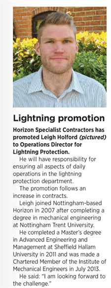 Horizon Specialist Contracting are featured in the February 2016 issue of the Business Network Magazine (produced by East Midlands Chamber), regarding the promotion of Leigh Holford to Operations Director for Lightning Protection. Leigh now has responsibility for ensuring all aspects of daily operations are run effectively and efficiently. Additionally, his role will encompass the development and deployment of personnel within the Lightning Protection department.